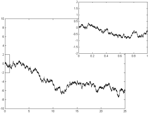 A sample path of Brownian motion, and a zoomed plot on a subinterval showing that the curve does not get smoother when it is zoomed in. (In fact, scaling the time axis by a factor a and the y-axis by a factor \sqrt{a}, yields a plot with exactly the same characteristics as the original.)