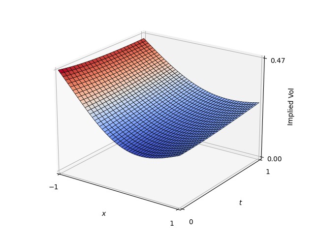 ➢ The images below show an example where the marginals are chosen according to the plotted ‘implied volatilities’. The (normal) implied volatility for each maturity time t and strike price x is, by definition, the constant value of volatility at which the call price equals C(t, x). That is, E[(Xt - x)+] is equal to same value as if Xt is normal with mean 0 and standard deviation σimp(t, x)√t. Implied volatilities are just a convenient alternative way of quoting call prices. I also show the call prices, the marginal densities, and the obtained local vols.