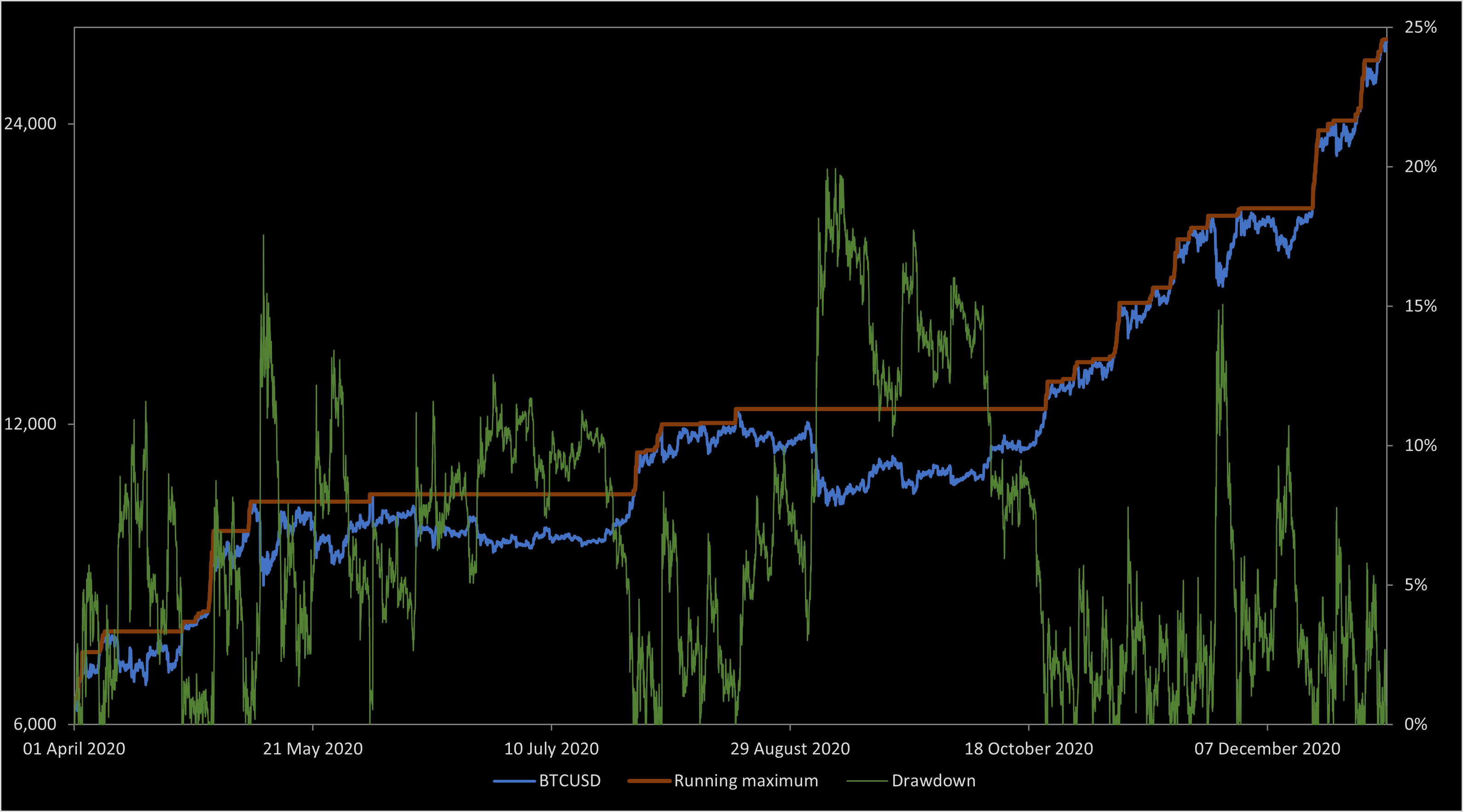 . Hence, the point process consisting of the drawdown excursions indexed by the running maximum, and the absolute value of the excursions from zero indexed by the local time, both have the same distribution. So, the theory described in this post applies equally to the excursions away from zero of a Brownian motion.